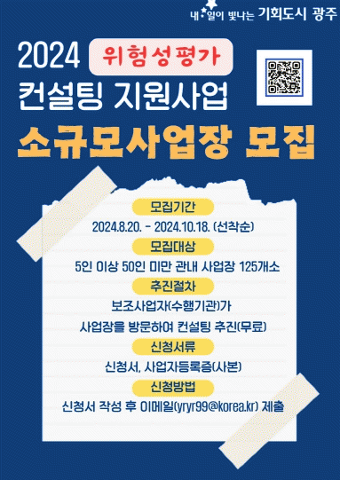 Á¢¼ö´Â ¿À´Â 10¿ù 18ÀϱîÁöÀ̸ç, »ê¾÷ÀçÇØ¿¹¹æ ÄÁ¼³ÆÃÀ» ¹Þ°íÀÚ ÇÏ´Â »ç¾÷ÀÚ´Â ±¤Áֽà ´©¸®Áý ¡®°í½Ã¡¤°ø°í¡¯¿¡¼ À§Ç輺 Æò°¡ ÄÁ¼³ÆÃ ´ë»ó »ç¾÷Àå ¸ðÁý °ø°í¸¦ È®ÀÎÇÏ¸é µÈ´Ù.