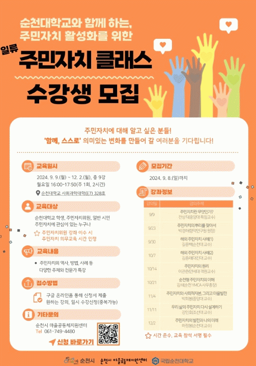 À̹ø ±³À°°úÁ¤Àº Àü»óÁ÷ Çѱ¹ÁÖ¹ÎÀÚÄ¡ÇÐȸÀå(Áß¾Ó´ë Æ¯ÀÓ±³¼ö)ÀÇ ¡ãÁÖ¹ÎÀÚÄ¡¶õ ¹«¾ùÀΰ¡ Ưº°°¿¬À» ½ÃÀÛÀ¸·Î ¡ãÁÖ¹ÎÀÚÄ¡ÀÇ ±â¿ø°ú ¿ª»ç ¡ãÁÖ¹ÎÀÚÄ¡ÀÇ ¿ø¸® ¡ãÁÖ¹ÎÀÚÄ¡ »ç·Ê ¡ã¼øÃµÇü ÁÖ¹ÎÀÚÄ¡ÀÇ ÀÌÇØ ¡ã»çȸÀûÀÚº»°ú ¸¶À»¹ßÀü ¡ã¿ì¸® »îÀÇ ÁÖ¹ÎÀÚÄ¡ ¼³°è ¡ãÁÖ¹ÎÀÚÄ¡ÀÇ ¹ßÀü°ú ³ªÀÇ ¹Ì·¡ µî ÇØ´ç ºÐ¾ßÀÇ Àü¹®°¡µéÀÌ Âü¿©ÇÏ¿© ÁÖ¹ÎÀÚÄ¡ÀÇ ±âº»ºÎÅÍ ½ÉÈ °úÁ¤±îÁö ½Éµµ ÀÖ°Ô ±¸¼ºµÆ´Ù.