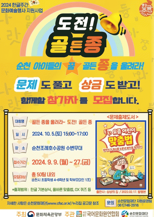 ¡¸µµÀü! °ñµçÁ¾¡¹Àº 10¿ù 5ÀÏ Á¶·ÊÈ£¼ö°ø¿ø¿¡¼ ÁøÇàµÇ¸ç, ¡®±¦Âú¾Æ?! Çѱۡ¯À̶ó´Â ÁÖÁ¦·Î Àڶ󳪴 ¾î¸°À̵鿡°Ô ÇѱÛÀÇ Á߿伺°ú Á¸¾ö¼ºÀ» Àϱú¿öÁÖ´Â °ÍÀ» ¸ñÇ¥·Î ÇÑ´Ù.