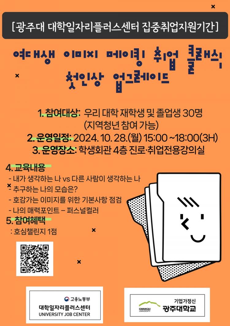 ±¤ÁÖ´ë ÀçÇлý ¹× Á¹¾÷»ý, Áö¿ªÃ»³â 30¸íÀ» ´ë»óÀ¸·Î ¿À´Â 10¿ù 28ÀÏ Çлýȸ°ü 4Ãþ Áø·Î¡¤Ãë¾÷Àü¿ë°Àǽǿ¡¼ ÁøÇàµÉ À̹ø Ư°Àº ùÀλóÀ» °³¼±Çϰí, ÀڽŸ¸ÀÇ ¸Å·ÂÀ» °ÈÇÏ´Â À̹ÌÁö ¸ÞÀÌÅ· ¹æ¹ý¿¡ ´ëÇØ ½Éµµ ÀÖ°Ô ´Ù·ê ¿¹Á¤ÀÌ´Ù. ±³À°Àº ¡ã³»°¡ »ý°¢ÇÏ´Â ³ª vs ´Ù¸¥ »ç¶÷ÀÌ »ý°¢ÇÏ´Â ³ª ¡ãÃß±¸ÇÏ´Â ³ªÀÇ ¸ð½À ¡ãÈ£°¨À» ÁÖ´Â À̹ÌÁö¸¦ À§ÇÑ ±âº» »çÇ× Á¡°Ë ¡ã³ªÀÇ ¸Å·Â Æ÷ÀÎÆ®-ÆÛ½º³Î Ä÷¯ µîÀ¸·Î ±¸¼ºµÅ ÀÖ´Ù.