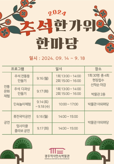 ±¤ÁÖ¿ª»ç¹Î¼Ó¹Ú¹°°üÀº ¿À´Â 14ÀϺÎÅÍ 18ÀϱîÁö ¹Ú¹°°ü°ú ¾ß¿Ü¸¶´ç¿¡¼ ¡®2024³â Ãß¼® ÇѰ¡À§ ÇѸ¶´ç¡¯ Çà»ç¸¦ ÁøÇàÇÑ´Ù. ¹Î¼Ó³îÀÌüÇè(14~18ÀÏ), Ç»Àü±¹¾Ç°ø¿¬(16~17ÀÏ), Ãß¼®´Ù°ú»ó ¸¸µé±â µî ÀüÅë°ø¿¹Ã¼Çè(16~17ÀÏ)ÀÌ ÁøÇàµÉ ¿¹Á¤ÀÌ´Ù.