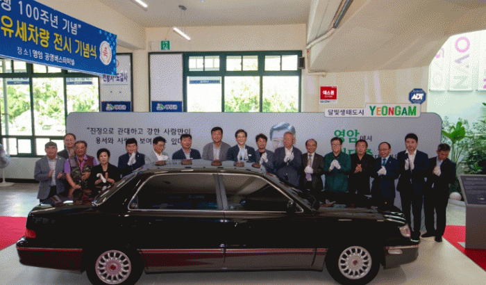 ¾ÕÀ¸·Î ¿µ¾Ï°ø¿µ¹ö½ºÅ͹̳ο¡ ¹æ¹®Çϸé, ±è Àü ´ëÅë·ÉÀÇ ¾ó±¼°ú ¡®¿µ¾Ï¿¡¼ ±è´ëÁß ´ëÅë·ÉÀ» ±â¾ïÇÏ´Ù¡¯´Â ¹®±¸°¡ ´ã±ä °¡·Îº® ¾Õ¿¡ Àü½ÃµÈ Àü½Ã À¯¼¼Â÷·®À» º¼ ¼ö ÀÖ´Ù.