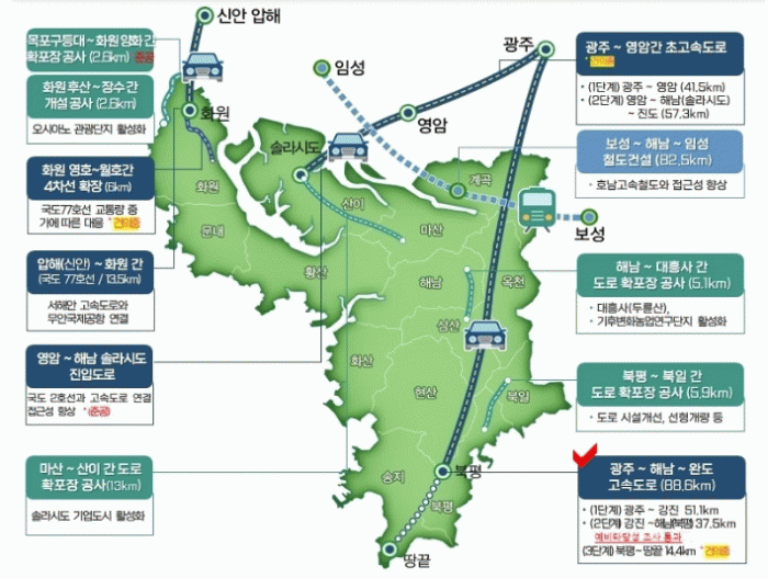 ±¤ÁÖ~¿Ïµµ°£ °í¼Óµµ·Î 2´Ü°è »ç¾÷Àº °Áø ÀÛõ¿¡¼ ÇØ³² ³²Ã¢±îÁö 38.9km °í¼Óµµ·Î¸¦ °³¼³ÇÏ´Â »ç¾÷À¸·Î, »ç¾÷ºñ 1Á¶ 5,965¾ï¿øÀÌ ¼Ò¿äµÈ´Ù. ¿Áõ¸é¿¡¡®Çس² ³ªµé¸ñ¡¯°ú ºÏÆò¸é¿¡¡®³²Çس² ³ªµé¸ñ¡¯µî 2°³ÀÇ ³ªµé¸ñ(IC)ÀÌ »ý±â°í, Á¾Á¡ºÎ°¡ ÇØ³²±ºÀ̱⠶§¹®¿¡ ¸íεµ¡®±¤ÁÖ~ÇØ³² °£ °í¼Óµµ·Î(°¡Äª)¡¯·Î º¯°æµÉ Àü¸ÁÀÌ´Ù.