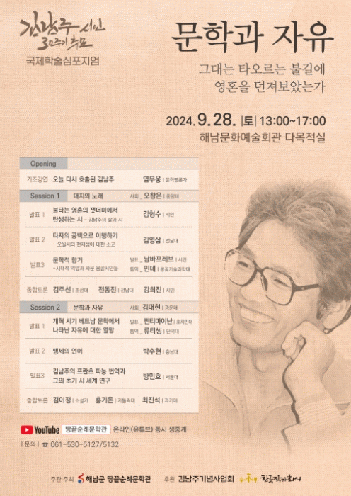 ¿À´Â 9¿ù 28ÀÏ ¿ÀÈÄ1½Ã ÇØ³²¹®È¿¹¼úȸ°ü ´Ù¸ñÀû½Ç¿¡¼ ¿¸®´Â ½ÉÆ÷Áö¾öÀº ±è³²ÁÖ ½ÃÀÎÀÇ ¹®ÇÐÁ¤½ÅÀ» °üÅëÇÏ´Â ¼ÒÀçÀΡ®¹®Çаú ÀÚÀ¯: ±×´ë´Â Ÿ¿À¸£´Â ºÒ±æ¿¡ ¿µÈ¥À» ´øÁ®º¸¾Ò´Â°¡¡¯¸¦ ÁÖÁ¦·Î ±¹³»¿Ü ´Ù¾çÇÑ ÀÛ°¡, Æò·Ð°¡, ¿¬±¸ÀÚµéÀÌ ¸ð¿© ½Éµµ ÀÖ´Â Çмú Çà»ç¸¦ ²Ù¸± ¿¹Á¤ÀÌ´Ù.