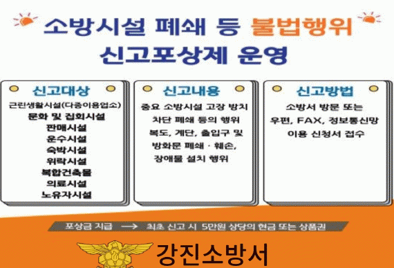 ¼Ò¹æ½Ã¼³ ºÒ¹ýÇàÀ§ ½Å°íÆ÷»óÁ¦´Â ºñ»ó±¸ µî ¼Ò¹æ½Ã¼³¿¡ °¡ÇØÁö´Â ºÒ¹ýÇàÀ§¸¦ ½Å°íÇÏ´Â °æ¿ì Æ÷»ó±ÝÀ» Áö±ÞÇÏ´Â Á¦µµ´Ù. ¼Ò¹æ½Ã¼³¿¡ ´ëÇÑ ½Ã¹ÎÀÇ °æ°¢½É °íÃë¿Í ¾ÈÀüÀÇ½Ä È®»êÀ» ÅëÇØ ÈÀ縦 ¿¹¹æÇϰí ÇÇÇØ¸¦ ÃÖ¼ÒÈÇϰíÀÚ ÃßÁøµÈ Á¦µµ´Ù.