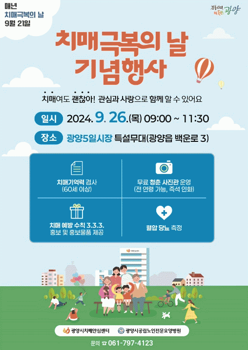 ±¤¾ç½Ã Ä¡¸Å¾È½É¼¾ÅÍ¿Í ±¤¾ç½Ã °ø¸³³ëÀÎÀü¹®¿ä¾çº´¿øÀÌ Çù·ÂÇØ °³ÃÖÇÏ´Â À̹ø Çà»ç´Â Ä¡¸Å¿Í ´õºÒ¾î »ì¾Æ°¥ ¼ö ÀÖ´Â »çȸÀû °ø°¨´ë¸¦ Çü¼ºÇϰí Ä¡¸Å Ä£ÈÀû ȯ°æÀ» Á¶¼ºÇϱâ À§ÇØ ¸¶·ÃµÆ´Ù.