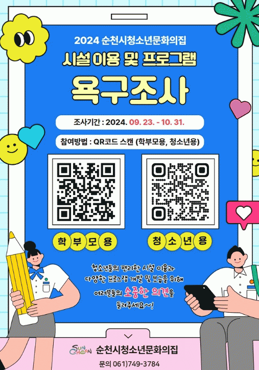 À̹ø Á¶»ç´Â ½Ã¼³ÀÌ¿ë, û¼Ò³â ÇÁ·Î±×·¥, û¼Ò³â ¹æ°úÈÄ È°µ¿ µî 3°³ ºÐ¾ß·Î ±¸¼ºµÆÀ¸¸ç, È«º¸ Æ÷½ºÅÍ ³»¿¡ ÀÖ´Â QRÄڵ带 ÅëÇØ Á¶»ç¿¡ Âü¿©ÇÒ ¼ö ÀÖ´Ù.