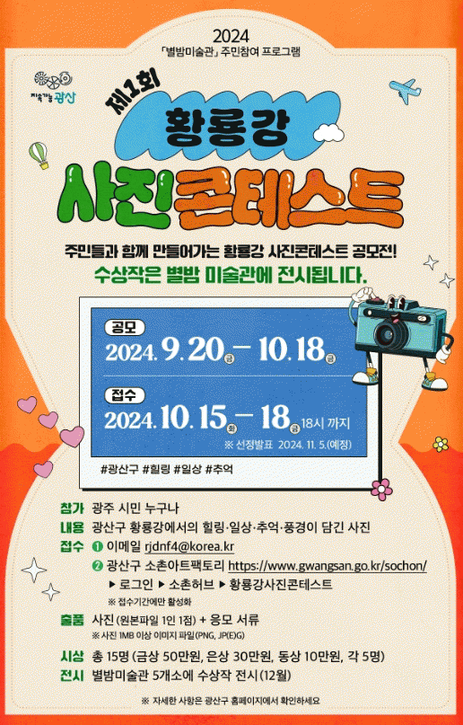 Á¦1ȸ Ȳ·æ° »çÁø ÄÜÅ×½ºÆ®¿¡ ´ëÇÑ ÀÚ¼¼ÇÑ ³»¿ëÀº ±¤»ê±¸ ¹®È¿¹¼ú°ú ¼ÒÃÌ¾ÆÆ®ÆÑÅ丮(062-960-3688)·Î ¹®ÀÇÇÏ¸é µÈ´Ù.