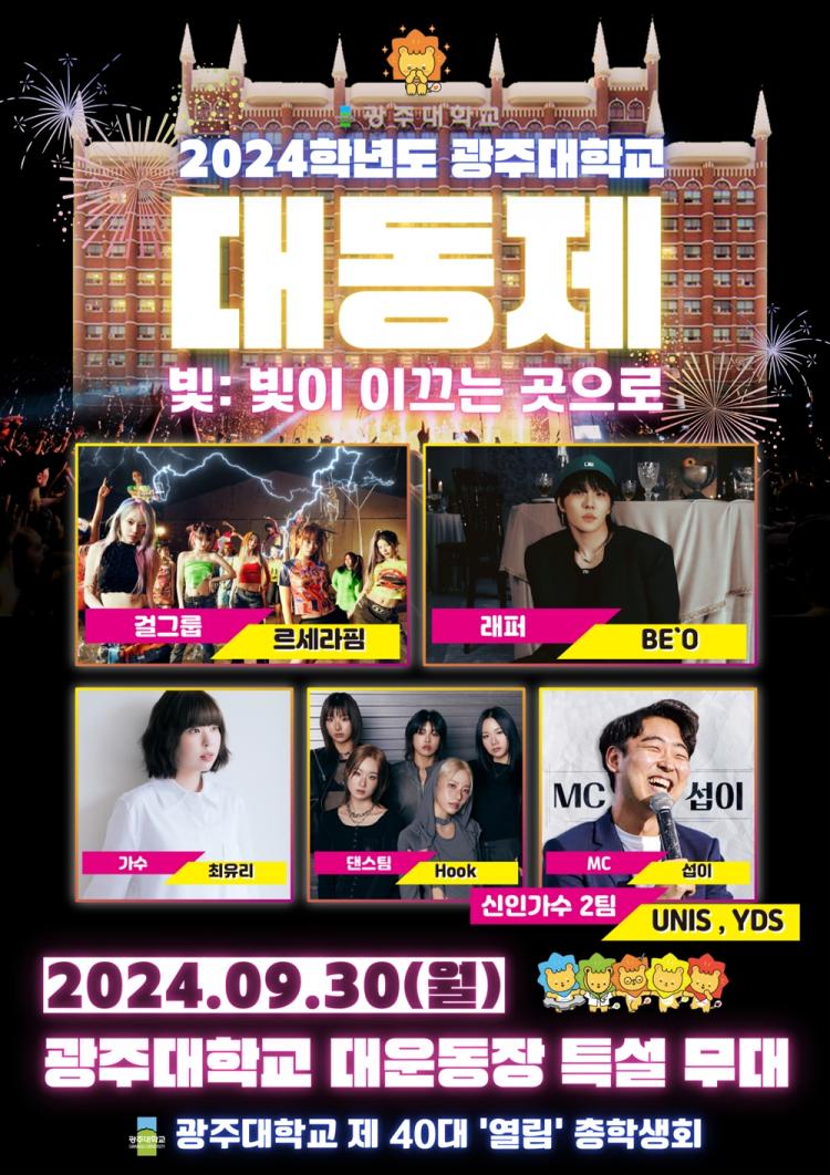 ƯÈ÷ ´ëµ¿Á¦ÀÇ ÈïÀ» ÃÖ°íÁ¶·Î ²ø¾î¿Ã¸± ÃÊû°ø¿¬Àº ¿ÀÈÄ 6½Ã ±¤ÁÖ´ë Ä¡¾î¸®µùÆÀ °ø¿¬À¸·Î ¹®À» ¿°í, ´ëÇÐÃàÁ¦ Àü¹® MC ¼·ÀÌÀÇ ÁøÇàÀ¸·Î 4¼¼´ë KÆË °£ÆÇ 5ÀÎÁ¶ °É±×·ì ¸£¼¼¶óÇËÀ» ºñ·ÔÇØ ´ë¼¼ ÈüÇÕ ·¡ÆÛ ºñ¿À(BE'O), ÈÅ, ÃÖÀ¯¸®, À¯´Ï½º, YDS°¡ ¹«´ë¿¡ ¿À¸¥´Ù.