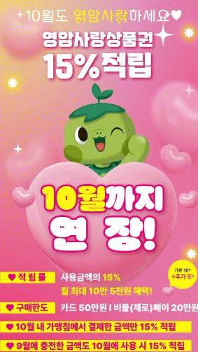 9¿ù°ú ¸¶Âù°¡Áö·Î À̹ø À̺¥Æ®ÀÇ ±¸¸ÅÇѵµ´Â 1ÀÎ ¿ù 70¸¸¿ø(Ä«µå 50, ¸ð¹ÙÀÏ 20)À̰í, 10¿ù ³»¿¡ ¿µ¾Ï»ç¶û»óǰ±Ç °¡¸ÍÁ¡¿¡¼ °áÁ¦Çϸé 15% Àû¸³ ÇýÅÃÀ» ¹ÞÀ» ¼ö ÀÖ´Ù.