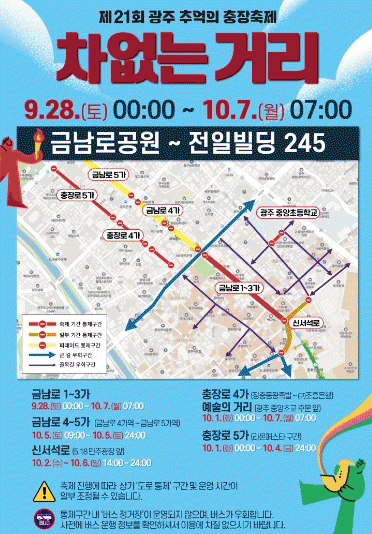 ¿¹¼úÀÇ °Å¸®¿Í ±Ý³²·Î 4°¡ Áê¾ó¸® °Å¸®´Â 10¿ù1ÀÏ ÀÚÁ¤ºÎÅÍ 10¿ù7ÀÏ ¿ÀÀü 7½Ã±îÁö Â÷·®ÀÌ ÅëÁ¦µÇ¸ç À̹ۿ¡ dz³²¿Á~ÃæÀå·Î 1°¡ ÀÔ±¸´Â 2ÀϺÎÅÍ 6ÀϱîÁö ¸ÅÀÏ ¿ÀÈÄ 2½ÃºÎÅÍ ÀÚÁ¤±îÁö Â÷·® ¿îÇàÀ» ¸·´Â´Ù.