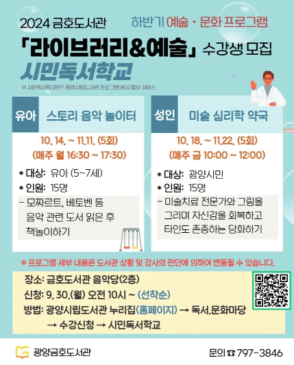 ¡®¶óÀ̺귯¸®&¿¹¼ú¡¯Àº ±ÝÈ£µµ¼°üÀº Æ¯È ÁÖÁ¦ÀÎ ¿¹¼ú°ú µ¶¼¸¦ °áÇÕÇÑ ±³À° ÇÁ·Î±×·¥ÀÌÀ¸·Î, ±ÝÈ£µµ¼°ü¿¡¼´Â »ý¾ÖÁֱ⿡ µû¶ó ¸ÂÃãÇü üÇè ±âȸ, ÇнÀ ±âȸ¸¦ Á¦°øÇϱâ À§ÇØ ¿ÃÇØ ÇϹݱâ À¯¾Æ¿Í ¼ºÀÎÀ» ´ë»óÀ¸·Î µÎ °¡Áö ÇÁ·Î±×·¥À» ±âȹÇß´Ù.