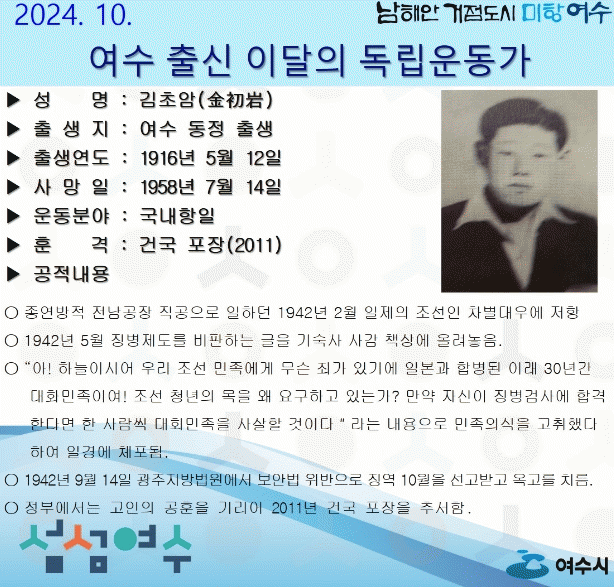 ±èÃÊ¾Ï ¼±»ýÀº Á¾¿¬¹æÀû Àü³²°øÀå Á÷°øÀ¸·Î ÀÏÇÏ´ø 1942³â 2¿ù ÀÏÁ¦ÀÇ Á¶¼±ÀÎ Â÷º°´ë¿ì¿¡ ÀúÇ×ÇÏ¿© ±×ÇØ 5¿ù ¡º´Á¦µµ¸¦ ºñÆÇÇÏ´Â ±ÛÀ» ±â¼÷»ç »ç°¨ Ã¥»ó¿¡ ¿Ã·Á³õ¾ÒÀ¸¸ç, ¹ÎÁ·ÀǽÄÀ» °íÃëÇß´Ù´Â ¸í¸ñÀ¸·Î Àϰ濡 üÆ÷µÆ´Ù.