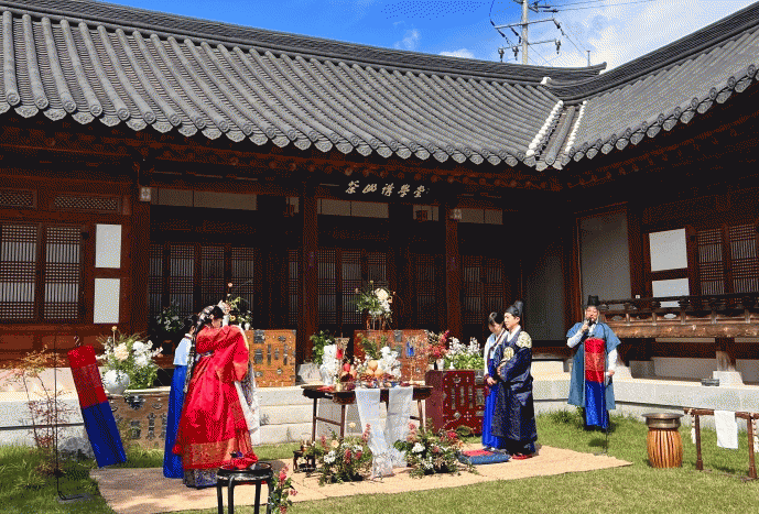 À̹ø ÀüÅë È¥·Ê´Â ½Å¶û°ú ½ÅºÎ°¡ ÀüÅë È¥·Êº¹À» ÀÔ°í, ¸ÂÀý°ú ´ë·Ê µî ÀüÅë ¹æ½ÄÀ» µû¶ú´Ù. À̹ø °áÈ¥½ÄÀº ´ç½ÃÀÇ ÀüÅë À½¾Ç°ú ¹«¿ëÀÌ ¾î¿ì·¯Á® ´õ¿í ±íÀº °¨µ¿À» ¼±»çÇß´Ù. È¥·Ê ÈÄ¿¡´Â ½Å¶û°ú ½ÅºÎ°¡ ¸¶·ÃÇÑ ÀüÅë À½½ÄÀ» ÇÔ²² ³ª´©´Â ÀÛÀº ¿¬È¸µµ ÁøÇàµÇ¾î, ¹æ¹®°´µéÀÌ ÇÔ²² ÃàÇÏÀÇ ÀÚ¸®¸¦ Áñ°å´Ù.