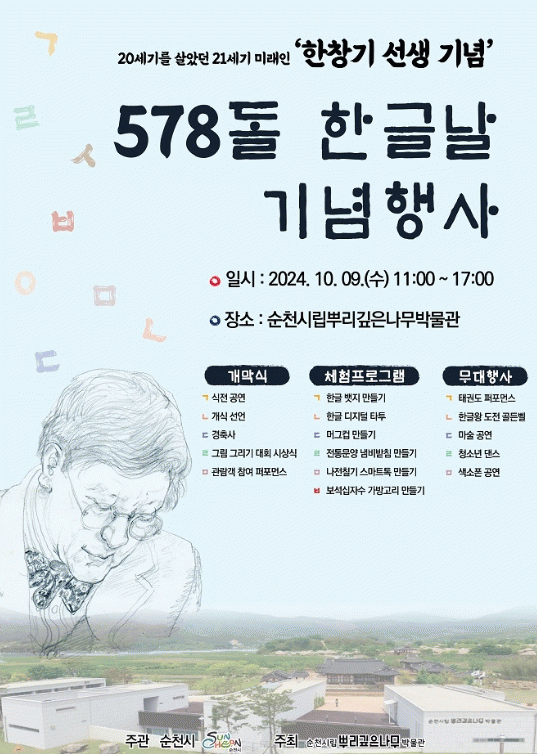 ¼øÃµ½Ã¸³»Ñ¸®±íÀº³ª¹«¹Ú¹°°ü °ü°èÀÚ´Â ¡°À̹ø Çѱ۳¯ Çà»ç¸¦ ÅëÇØ ÇѱÛÀÇ ¼ÒÁßÇÔ°ú ¿ì¸® ¹®ÈÀÇ »Ñ¸®¸¦ µÇ»õ±â°í, ÇÑâ±â ¼±»ýÀÇ ¶æÀ» ±â¸®´Â ½Ã°£À» °¡Áö½Ã±æ ¹Ù¶õ´Ù¡±°í ¸»Çß´Ù.
