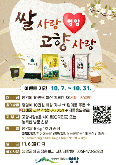 ¿µ¾Ï ½Ò ÆÇ¸Å¿Í °íÇâ»ç¶û±âºÎ ÃËÁøÀ» º´ÇàÇÏ´Â ÀÌ À̺¥Æ®´Â, ´ä·Êǰ¿¡ 3¸¸¿ø »ó´çÀÇ ¿µ¾Ï ½ÒÀ» Ãß°¡·Î Á¦°øÇÏ´Â ³»¿ë.