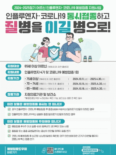 Á¢Á¾ ±â°£Àº 10¿ù11ÀϺÎÅÍ ³»³â 4¿ù30ÀϱîÁö·Î 65¼¼ ÀÌ»ó °í·ÉÃþÀÇ °æ¿ì ÇÑ ¹øÀÇ ÀÇ·á±â°ü ¹æ¹®À» ÅëÇØ Äڷγª19¿Í ÀÎÇ÷翣ÀÚ ¹é½ÅÀ» µ¿½Ã Á¢Á¾ÇÒ ¼ö ÀÖµµ·Ï ¿¬·Éº° Á¢Á¾ ½Ã±â¸¦ ÅëÀÏÇß´Ù. ¡ã75¼¼ ÀÌ»ó °í·ÉÃþÀº 11ÀϺÎÅÍ ¡ã70~74¼¼ °í·ÉÃþÀº 15ÀϺÎÅÍ ¡ã65~69¼¼ °í·ÉÃþÀº 19ÀϺÎÅÍ Á¢Á¾ °¡´ÉÇÏ´Ù. µ¿½Ã Á¢Á¾ÇÒ °æ¿ì Äڷγª19¿Í ÀÎÇ÷翣ÀÚÀÇ Á¢Á¾ ºÎÀ§¸¦ ´Þ¸®ÇØ ¹Þ´Â´Ù.