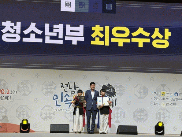 Áö³ 9¿ù 30ÀϺÎÅÍ 10¿ù 2ÀϱîÁö ¿Ïµµ¿¡¼ °³ÃÖµÈ Á¦47ȸ Àü³²¹Î¼Ó¿¹¼úÃàÁ¦¿¡¼ û¼Ò³âºÎ Âü°¡ÆÀ ¡®Áö»êÃʵîÇб³(Áøµµ¼ÒÆ÷°É±º³ó¾Ç)¡¯´Â ÃÖ¿ì¼ö»óÀ» ¹Þ¾Ò°í, ÀϹݺΠÂü°¡ÆÀ ¡®ÁøµµÀ¯¹èÁö ÇÑÃ㺸Á¸È¸(ÁøµµÀ¯¹èÁö ÇÑÃã)¡¯´Â Àå·Á»óÀ» ¹Þ¾Ò´Ù.