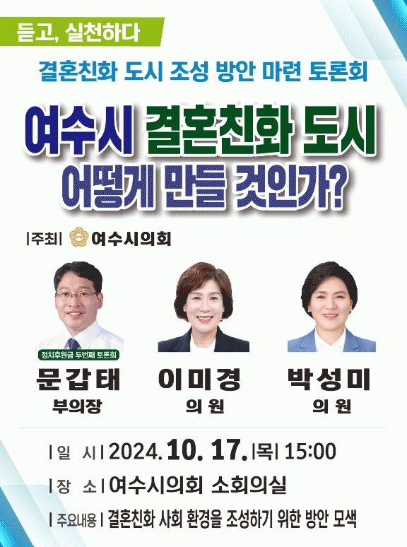 ÀÌÈÄ ÀÚÀ¯Åä·Ð ½Ã°£¿¡´Â ¿©¼ö½Ã ¿©¼ºÀη°³¹ß¼¾ÅÍ, YWCA, û³â Áö¿ø¼¾ÅÍ µî ´Ù¾çÇÑ ÀÌÇØ°ü°èÀÚµéÀÌ Âü¿©ÇØ °áȥģȵµ½Ã Á¶¼º¿¡ ´ëÇÑ Æø³ÐÀº ÀǰßÀ» ³ª´ ¿¹Á¤ÀÌ´Ù.