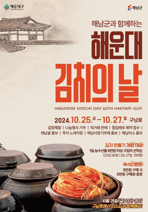 1ÀÏ ³ó¼ö»ê¹° 5¸¸¿ø ÀÌ»ó ±¸ÀÔ°í°´Àº ¼±Âø¼øÀ¸·Î ±èÄ¡¸¸µé±â üÇè µî¿¡ Âü¿©ÇÒ ¼ö ÀÖ´Ù. 3Àϰ£ ÃÑ 250¸íÀ» ´ë»óÀ¸·Î Á÷Á¢ ±èÄ¡¸¸µé±â¸¦ üÇèÇϰí, ¸¸µç ±èÄ¡´Â °¡Á®°¥ ¼ö ÀÖµµ·Ï Çϰí ÀÖ´Ù. 25ÀÏ ÁÖ¿äÀλ簡 Âü¿©ÇØ ¹ö¹«¸° ±èÄ¡´Â ÇØ¿î´ë±¸ °¢°è°¢Ãþ¿¡ ±âºÎµÈ´Ù.