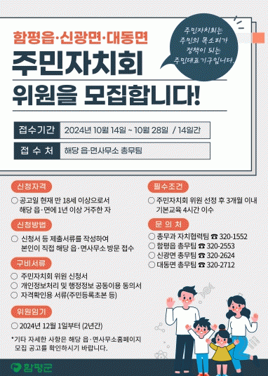 ÁÖ¹ÎÀÚġȸ À§¿øÀÌ µÇ·Á¸é À§¿ø ¼±Á¤ ÈÄ ÁÖ¹ÎÀÚÄ¡ ±âº»±³À° 4½Ã°£À» À̼öÇØ¾ß Çϸç, ÀÓ±â´Â 2³âÀ¸·Î ¿¬ÀÓÀÌ °¡´ÉÇÏ´Ù. ±âŸ ÀÚ¼¼ÇÑ »çÇ×Àº ÇÔÆò±º ´©¸®Áý ¸ðÁý °ø°í¹®À» È®ÀÎÇÏ¸é µÈ´Ù.