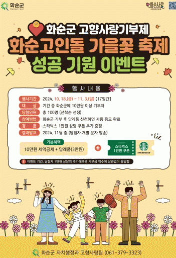 À̺¥Æ® ±â°£ ³»¿¡ ȼø±º ±âºÎ Âü¿©ÀÚ¸¦ ´ë»óÀ¸·Î ¼±Âø¼ø 100¸í¿¡°Ô ½ºÅ¸¹÷½º 1¸¸ ¿ø ÄíÆùÀ» Ãß°¡ ÁõÁ¤ÇÒ ¿¹Á¤À̸ç, ¿Â¶óÀÎ(°íÇâ»ç¶ûeÀ½), ¿ÀÇÁ¶óÀÎ(NH³óÇùÀºÇà)À» ÅëÇØ ȼø±º¿¡ 10¸¸ ¿ø ÀÌ»ó ±âºÎÇÏ°í ´ä·ÊǰÀ» ÁÖ¹®Çϸé ÀÚµ¿ ÀÀ¸ðµÈ´Ù.