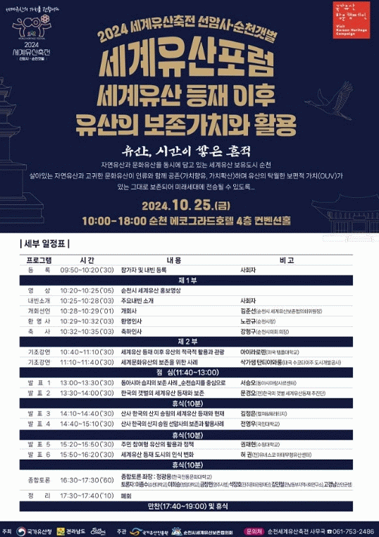 À̹ø Æ÷·³Àº ¿¬ÀÏ ¿±â¸¦ ´õÇØ °¡´Â ¡®2024 ¼øÃµ ¼¼°èÀ¯»êÃàÀü¡¯ÀÇ °¡Ä¡¸¦ ¾Ë¸®´Â ÇмúÇà»ç·Î °³ÃֵǸç, ¡¸¼±¾Ï»ç.¼øÃµ°¹¹úÀÇ ¼¼°èÀ¯»ê µîÀç ÀÌÈÄ À¯»êÀÇ °¡Ä¡ º¸Á¸°ú Ȱ¿ë¡¹À̶ó´Â ÁÖÁ¦·Î ÁøÇàµÈ´Ù.