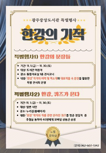 ±¤ÁÖÁß¾Óµµ¼°ü ¹®¸í¼÷ °üÀåÀº ¡°ÇѰ ÀÛ°¡ÀÇ ³ëº§¹®Çлó ¼ö»óÀ» ÅëÇØ ½Ã¹ÎµéÀÇ ¹®ÇÐÀû °ü½Éµµ°¡ ³ô¾ÆÁö±æ ±â´ëÇϸç, ÀÌ·Î½á ¡®´Ù½Ã Ã¥À¸·Î¡¯ µ¶¼±³À° ³»½ÇÈÀÇ °è±â°¡ µÇ±æ ¹Ù¶õ´Ù.¡±¶ó°í ÀüÇß´Ù.
