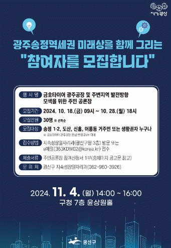 ±¤»ê±¸´Â ¿¬±¸¿ë¿ª ÁøÇà »óȲÀ» ¾Ë¸®°í, ±¤ÁÖ¼ÛÁ¤¿ª¼¼±Ç ¹ßÀü¿¡ ´ëÇÑ Æø³ÐÀº ÀǰßÀ» ¼ö·Å, ½Ã¹ÎÀû ³íÀǸ¦ ÃËÁøÇϱâ À§ÇØ Áß°£ º¸°íȸ¸¦ °âÇÑ ÁֹΠ°ø·ÐÀåÀ» ¿±â·Î Çß´Ù.