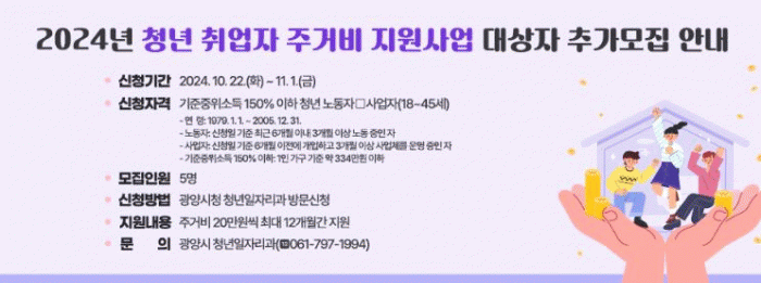 ¸ðÁý ±â°£Àº 10¿ù 22ÀϺÎÅÍ 11¿ù 1ÀϱîÁöÀ̸ç, ±¤¾ç½Ãû û³âÀÏÀÚ¸®°ú(3Ãþ)¿¡ ¹æ¹®ÇØ ½ÅûÇÏ¸é µÈ´Ù.