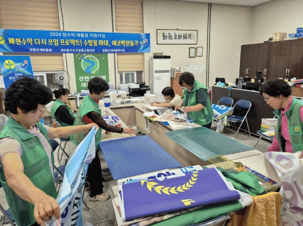 ÀÌ¿¡ ÀåÈﱺ»õ¸¶À»ºÎ³àȸ´Â ÆóÇö¼ö¸· ÀçȰ¿ë¿¡ °ü½ÉÀ» °®°í ÀåÈﱺ¿Á¿Ü±¤°íÇùȸÀÇ ÇùÁ¶·Î ¹ö·ÁÁú À§±â¿¡ ³õÀÎ ÆóÇö¼ö¸·À» ¼ö°ÅÇÏ¿© ºÐ·ù ÀÛ¾÷À» ÅëÇØ ÀϺθ¦ ¼öÇØ ¹æÁö¿ë ¸ð·¡ÁָӴϷΠȰ¿ëµÉ ¼ö¹æ¿ë ¸¶´ë, ¿¡ÄÚ¹é, ³ó¾÷¿ë ȺÐÀ¸·Î Àçź»ý ½ÃÄ×´Ù.