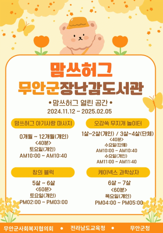 ±ºÀº ¹«¾È±º±³À°Áö¿øÃ»¿¡¼ Áö¿ª»çȸ¿¬°è ¿µÀ¯¾Æ ÇÁ·Î±×·¥ »ç¾÷ºñ 15¹é¸¸¿øÀ» Áö¿ø¹Þ¾Æ ¡ã¸¾¾²Çã±× ¾Æ±â»ç¶û ¸¶»çÁö ¡ã¿À°¨¾¦ ¹«Áö°³ ³îÀÌÅÍ ¡ãâÀÇºí·° ¡ãÄÉÀ̳ؽº °úÇлóÀÚ µîÀÇ ÇÁ·Î±×·¥À» 2024³â 11¿ù 12ÀϺÎÅÍ 2025³â 2¿ù 5ÀϱîÁö ¿î¿µÇÑ´Ù.
