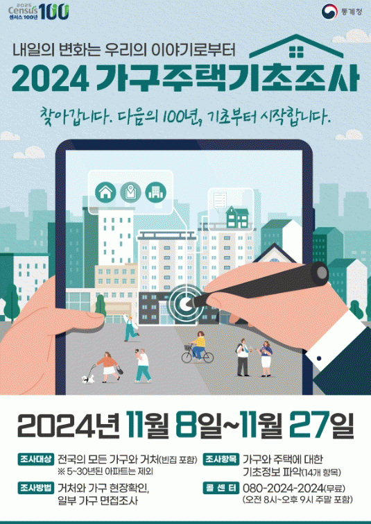5³â¸¶´Ù Àü±¹À» ´ë»óÀ¸·Î ÇÏ´Â °¡±¸ÁÖÅñâÃÊÁ¶»ç´Â ³»³â Àα¸ÁÖÅÃÃÑÁ¶»ç¿Í ³ó¸²¾î¾÷ÃÑÁ¶»çÀÇ Á¤È®ÇÑ Á¶»ç±¸ ¼³Á¤À» À§ÇØ Àü±¹ÀÇ ¸ðµç °Åó¿Í °¡±¸ÀÇ ±âÃÊÁ¤º¸¸¦ È®ÀÎÇÏ´Â Á¶»ç·Î Åë°èûÀÌ ÁÖ°üÇϰí ÁöÀÚü°¡ Çù·ÂÇØ ÁøÇàÇÏ´Â ´ë±Ô¸ð ±¹°¡Åë°è Á¶»ç´Ù.
