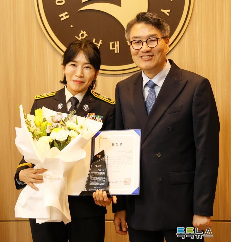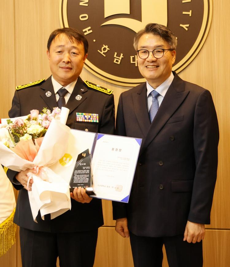 [ÅåÅå´º½º]¹Ú»óö È£³²´ëÇб³ ÃÑÀåÀº 11¿ù 8ÀÏ ÃÑÀå½Ç¿¡¼ Á¦ 62Áֳ⠼ҹæÀdz¯À» ¸Â¾Æ ±¤»ê¼Ò¹æ¼ ¼Ò¹æ°æ À̹̼÷ ¾ÈÀüº¸°ÇÆÀÀå°ú È£Á¦ÇÑ 119Àç³´ëÀÀ°ú ÁÖÀÓ(¼Ò¹æÀ§)¿¡°Ô ǥâÀå°ú °¨»çÆÐ¸¦ ¼ö¿©Çß´Ù.