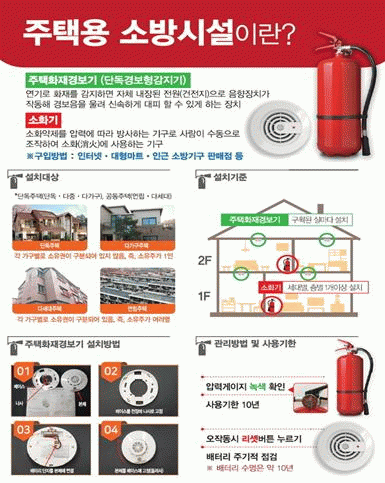 ÇöÇà ¡®¼Ò¹æ½Ã¼³ ¼³Ä¡ ¹× °ü¸®¿¡ °üÇÑ ¹ý·ü¡¯ Á¦10Á¶¿¡ µû¶ó ´Üµ¶ÁÖÅÃ, ¿¬¸³ÁÖÅÃ, ´Ù°¡±¸ÁÖÅÃ(¾ÆÆÄÆ® ¹× ±â¼÷»ç Á¦¿Ü)¿¡´Â ´Üµ¶°æº¸Çü °¨Áö±â¸¦ °¢ ½Ç(ħ½Ç, °Å½Ç, ÁÖ¹æ µî)¸¶´Ù õÀå¿¡ ¼³Ä¡Çϰí, ¼Òȱâ´Â ¼¼´ëº° ¶Ç´Â Ãþº°·Î 1°³¾¿ ±¸ºñÇØ¾ß ÇÑ´Ù.