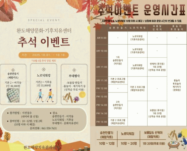À̺¥Æ®´Â 10¿ù 1ÀϺÎÅÍ 10ÀϱîÁö 9Àϰ£(Ãß¼® ´çÀÏ ÈÞ¹«) ¿ÏµµÇؾçÄ¡À¯¼¾ÅÍ¿Í ÇØ¾ç±âÈÄ¡¤¹®È Ä¡À¯¼¾ÅÍ¿¡¼ ÁøÇàµÈ´Ù.