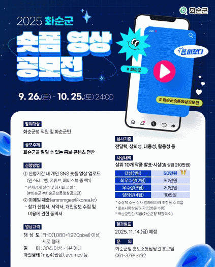 Âü°¡ ´ë»óÀº ȼø±ºÃ» Á÷¿ø ¹× ÀÏ¹Ý È¼ø±º¹ÎÀ̸ç, Á¢¼ö ±â°£Àº 2025³â 9¿ù 26ÀϺÎÅÍ 10¿ù 25ÀÏ ÀÚÁ¤(24:00)±îÁö´Ù. Âü°¡ÀÚ´Â º»ÀÎÀÇ SNS(ÀνºÅ¸±×·¥, À¯Æ©ºê, ÆäÀ̽ººÏ Áß Åà 1)¿¡ ¿µ»óÀ» Àüü °ø°³·Î ¾÷·Îµå ÈÄ, ÇØ´ç ¿µ»óÀÇ URL°ú ÇÔ²² Âü°¡ ½Åû¼¸¦ ´ã´çÀÚ À̸ÞÀÏ·Î Á¢¼öÇÏ¸é µÈ´Ù.
