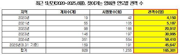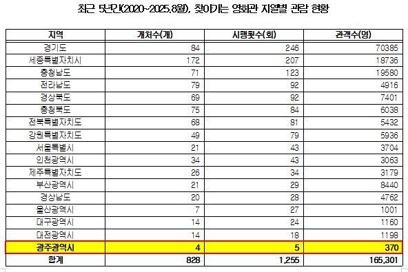 ±¹È¸ ¹®ÈüÀ°°ü±¤À§¿øÈ¸ ¹ÎÇü¹è ÀÇ¿ø(´õºÒ¾î¹ÎÁÖ´ç, ±¤ÁÖ ±¤»êÀ»)ÀÌ ¹®ÈüÀ°°ü±¤ºÎ·ÎºÎÅÍ Á¦Ãâ¹ÞÀº ÀÚ·á¿¡ µû¸£¸é, 2020³âºÎÅÍ 2025³â 8¿ù±îÁö Àüü 1,255°ÇÀÇ »ó¿µ °¡¿îµ¥ ±¤ÁÖ¿¡¼ ¿¸° °ÍÀº ´Ü 5°Ç¿¡ ºÒ°úÇß´Ù. 100°Ç Áß 4°Ç²ÃÀÌ´Ù.