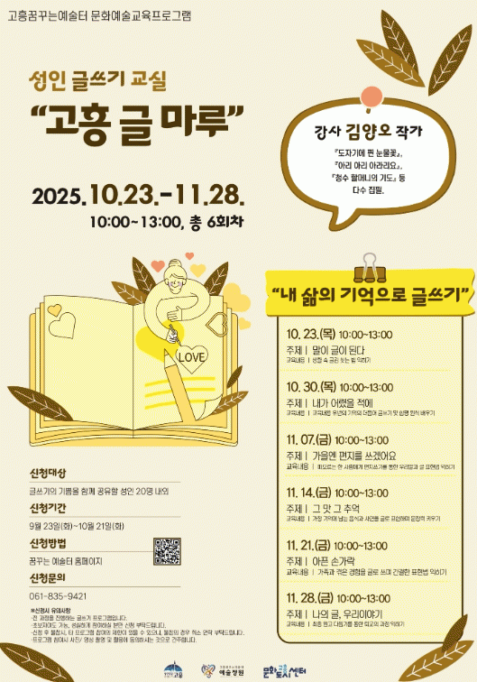 ¡®°íÈï ±Û¸¶·ç¡¯´Â ÃÑ 6ÁÖ °úÁ¤À¸·Î ¡ãÀÚ±â À̸§ »ïÇà½Ã Áþ±â ¡ã¾î¸° ½ÃÀý ±â¾ï°ú °¡Á· À̾߱⠡ãÃß¾ïÀÇ À½½Ä ±Û¾²±â ¡ã¸¶À½¼Ó Àι°¿¡°Ô ÆíÁö ¾²±â µîÀ¸·Î ±¸¼ºµÈ´Ù. ¸¶Áö¸· ½Ã°£¿¡´Â ±×µ¿¾È ÀÛ¼ºÇÑ ±ÛÀ» ´Ùµë¾î ³¶µ¶Çϰí, À̸¦ ÇϳªÀÇ ¼ÒÃ¥ÀÚ·Î ¿«´Â´Ù.