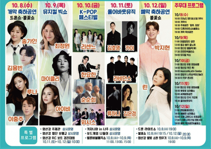 À̹ø ÃàÁ¦´Â 5Àϰ£ À̾îÁö´Â ´Ù¾çÇÑ °ø¿¬°ú üÇè ÇÁ·Î±×·¥À» ÅëÇØ ³ªÁÖÀÇ ¿ª»ç¿Í ¹®È¸¦ ¾Ë¸®°í, ¿µ»ê°ÀÇ ¾Æ¸§´Ù¿òÀ» ¿¹¼ú·Î Ç®¾î³½´Ù. ¹«¾ùº¸´Ùµµ ¼Û°¡ÀÎ, ÃÖÁ¤¿ø, ¸¶ÀÌŬ ¸®, ¾ÆÀ̺ñ, ±èÈ£¿µ, Ä«ÀÌ, ¸°, ¹ÚÁöÇö µî ±¹³» ÃÖÁ¤»ó±Þ ¾ÆÆ¼½ºÆ®¿Í K-POP ½ºÅ¸µéÀÌ ÃÑÃâµ¿ÇØ ¡®·¹Àüµå ¶óÀξ÷¡¯À¸·Î ¼Õ²ÅÈ÷´Â À̹ø ¿µ»ê°ÃàÁ¦´Â ±× ¾î´À ÇØº¸´Ù Å« °ü½ÉÀ» ²ø°í ÀÖ´Ù.