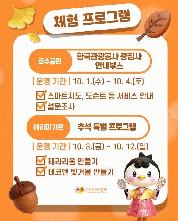 À̹ø ÇѰ¡À§ Ưº° ÇÁ·Î±×·¥Àº ÀÚ¿¬°ú ÇÔ²²ÇÏ´Â »ýÅ¡¤¿¹¼ú ±³À°À¸·Î Á¤¿øÀÇ °¡Ä¡¸¦ ¾Ë¸®°í, ÀüÅë °ø¿¬°ú ³îÀÌ, ÇѺ¹µ¥ÀÌ °°Àº ¹®È ÇÁ·Î±×·¥Àº ±¹°¡Á¤¿øÀÇ ¹®ÈÀû °ø°£¼ºÀÌ ´õ¿í È®ÀåµÇ´Â °è±â°¡ µÉ ¿¹Á¤ÀÌ´Ù.