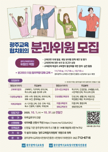 ¡®±¤ÁÖ±³À°ÇùġȸÀÇ¡¯´Â Áö¿ª»çȸ¿Í ÇÔ²²ÇÏ´Â ½Ã¹ÎÇùÄ¡ Ȱ¼ºÈ¸¦ À§ÇØ Áö³ 2023³â 1±â¸¦ ¸ðÁýÇß´Ù. ½Ã¹ÎÇùÄ¡ÁøÈï¿øÀº 1±â À§¿øÀÇ ÀӱⰡ ¿À´Â 10¿ù 31ÀÏ Á¾·áµÊ¿¡ µû¶ó 2±â À§¿øÀ» ¸ðÁýÇÑ´Ù.