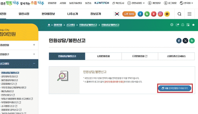 ³ªÁÖ½Ã(½ÃÀå À±º´ÅÂ)´Â Áö³ 9¿ù 26ÀÏ ¹ß»ýÇÑ ±¹°¡Á¤º¸ÀÚ¿ø°ü¸®¿ø ÈÀç ÀÌÈÄ ±¹¹Î½Å¹®°í¿Í ¾ÈÀü½Å¹®°í ±â´ÉÀÌ ÀϽà Áߴܵʿ¡ µû¶ó ½Ãû ´©¸®Áý¿¡ ¡®»õ¿Ã ÀüÀڹοøÃ¢±¸¡¯ Àӽà ÆäÀÌÁö¸¦ °³¼³ÇØ ÀÏ¹Ý ¹Î¿øÀ» Á¢¼öÇϰí ÀÖ´Ù°í 16ÀÏ ¹àÇû´Ù.