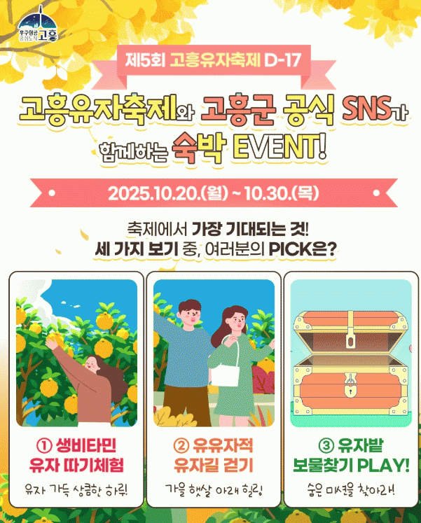 À̹ø À̺¥Æ®´Â Á¦5ȸ °íÈïÀ¯ÀÚÃàÁ¦ÀÇ ¼º°øÀûÀÎ °³ÃÖ¿Í °íÈﱺ °ø½Ä SNS Ȱ¼ºÈ ¹× Àü±¹ÀÇ °ü±¤°´µéÀÌ °íÈïÀÇ Ã»Á¤ ÀÚ¿¬°ú ¸ÀÀÖ´Â À½½Ä µî ´Ù¾çÇÏ°Ô °íÈïÀ» Áñ±æ ¼ö ÀÖ´Â ±âȸ¸¦ Á¦°øÇϱâ À§ÇØ ¸¶·ÃµÆ´Ù.