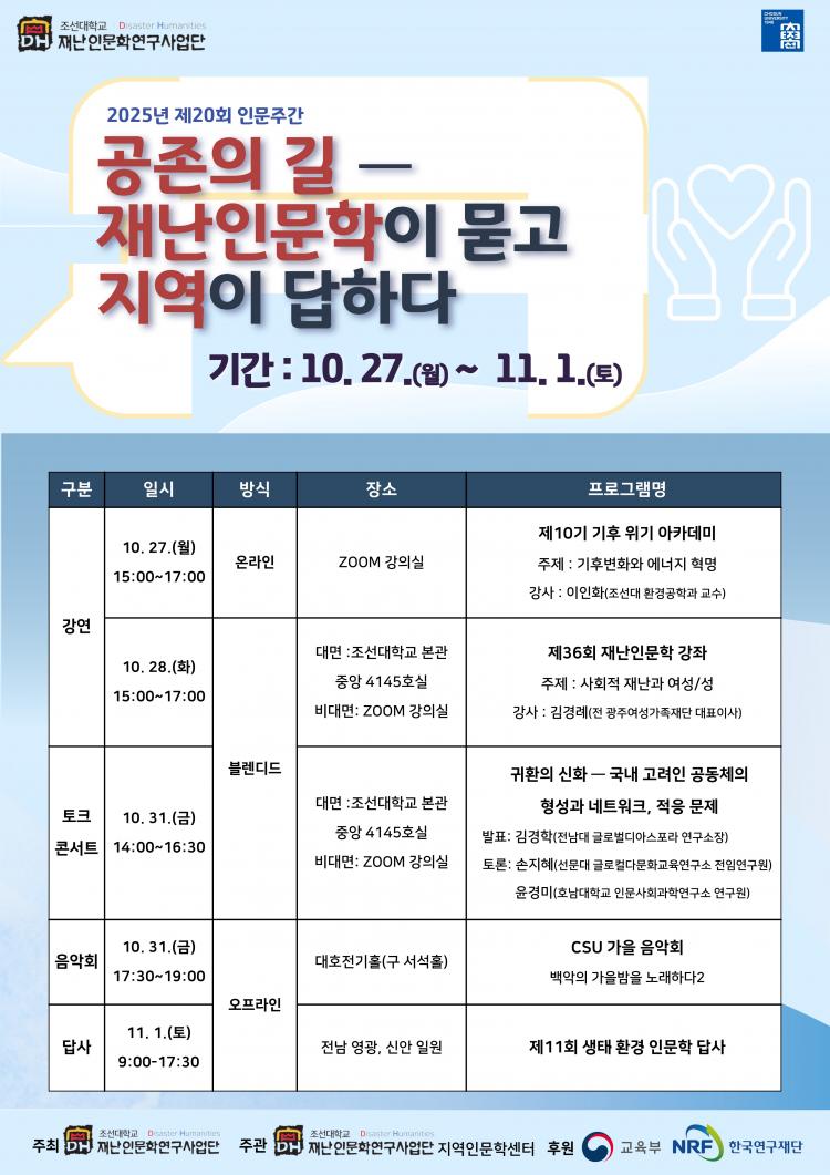 ¼¼ºÎ ÇÁ·Î±×·¥Àº ¡ã27ÀÏ(¿ù) Á¦10±â ±âÈÄÀ§±â ¾ÆÄ«µ¥¹Ì Ư° ¡®±âÈÄ º¯È¿Í ¿¡³ÊÁö Çõ¸í¡¯ ¡ã28ÀÏ(È) Á¦36ȸ Àç³Àι®ÇÐ °Á Ư° ¡®»çȸÀû Àç³°ú ¿©¼º/¼º¡¯ ¡ã31ÀÏ(±Ý) ÅäÅ©ÄܼƮ ¡®±¹³» °í·ÁÀÎ °øµ¿Ã¼ÀÇ Çü¼º°ú ³×Æ®¿öÅ©, ÀûÀÀ ¹®Á¦¡¯ ¡ã31ÀÏ(±Ý) CSU °¡À» À½¾Çȸ ¡®¹é¾ÇÀÇ °¡À»¹ãÀ» ³ë·¡ÇÏ´Ù2¡¯ ¡ã11¿ù 1ÀÏ(Åä) ¡®Á¦11ȸ »ýÅ¡¤È¯°æ¡¤Àι®ÇÐ ´ä»ç¡¯ µîÀ¸·Î ±¸¼ºµÆ´Ù.