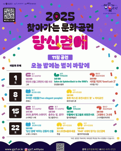 11¿ù 15ÀÏÀº 4°³ °ø¿¬ÀÌ ÁøÇàµÈ´Ù. ¡ã¼Ò¸®¸Þ±Â ³ª·¡ ¡®ãæÀûº® ½ºÅ×ÀÌÁö¡¯´Â ±¹¾Ç¿¡ ÀçÁ ÀÔÇô °·ÄÇÑ ¸Þ½ÃÁö¸¦ Àü´ÞÇÏ´Â °ø¿¬À» ¼±º¸ÀδÙ. µ¿±¸ ACC»ó»ó¸¶´ç. ¿ÀÈÄ 2½Ã30ºÐ. ¡ãºû°íÀ»´í¼½º ¡®ÃãÃß´Â ºû, ±¤ÁÖ!¡¯´Â ´Ù¾çÇÑ ¸Å·ÂÀÇ ½ºÆ®¸´´í½º¸¦ ¼±º¸ÀδÙ. µ¿±¸ ACC»ó»ó¸¶´ç. ¿ÀÈÄ 4½Ã. ¡ãº°»ç¶û¿¹¼ú´Ü ¡®¹«µ¹¿¡¼ ºû°íÀ»·Î Èñ¸ÁÄܼƮ¡¯´Â ´ëÁßÀ½¾ÇÀ» ¼±º¸ÀδÙ. ³²±¸ Ǫ¸¥±æ°ø¿ø. ¿ÀÈÄ 4½Ã. ¡ã±×³ªµ¥Ã¿·ÎÄ⸣ÅÝ ¡®±×´ë¿Í ³ª ±×³ªµ¥¡¯´Â µðÁî´Ï À½¾ÇºÎÅÍ °íÀü¸íÈ À½¾Ç±îÁö ÿ·Î·Î Ŭ·¡½Ä ¹«´ë¸¦ ¼±º¸ÀδÙ. ±¤»ê±¸ ¿î³²±Ù¸°°ø¿ø. ¿ÀÈÄ 4½Ã.