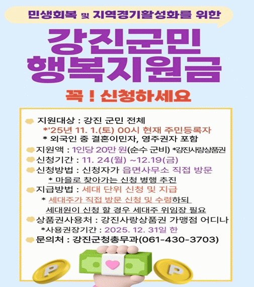 Áö¿ø´ë»óÀº 10¿ù 31ÀÏ ±âÁØÀ¸·Î °Áø±º¿¡ ÁÖ¼Ò¸¦ µÐ ±º¹ÎÀÌ¸é ´©±¸³ª ½Åû°¡´ÉÇÏ´Ù. ¶ÇÇÑ ¿Ü±¹ÀÎ Áß °áÈ¥À̹ÎÀÚ¿Í ¿µÁÖ±ÇÀ» °¡Áø »ç¶÷µµ Æ÷ÇԵȴÙ.