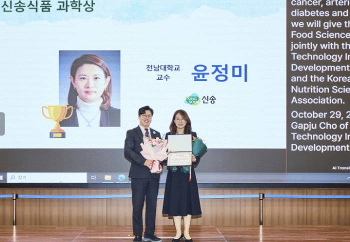 À±Á¤¹Ì ±³¼ö´Â ¡°À̹ø ¡®½Å¼Û ½Äǰ°úÇÐ»ó¡¯ ¼ö»óÀ» °è±â·Î, ¾ÕÀ¸·Îµµ ½ÇÇè½Ç ¿¬±¸¸¦ ³Ñ¾î »ê¾÷ ÇöÀå¿¡¼ Àû¿ë °¡´ÉÇÑ ¿¬±¸¸¦ È®´ëÇØ ³ª°¡¸ç ±¹¹Î°Ç° ÁõÁø°ú ½Äǰ»ê¾÷ ¹ßÀü¿¡ ±â¿©Çϰڴ١±°í ¼Ò°¨À» ÀüÇß´Ù.