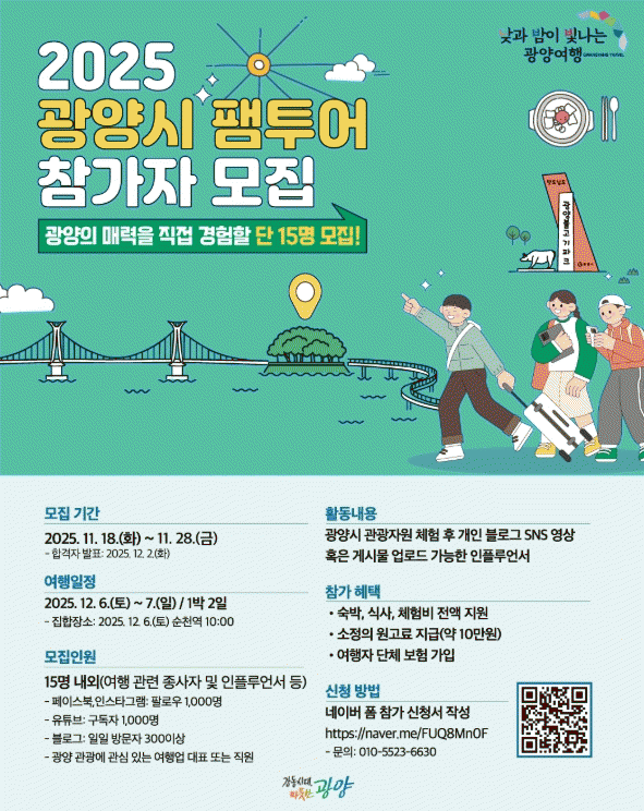 ¼±¹ßµÈ ÆÔÅõ¾î Âü°¡ÀÚµéÀº ±¤¾çÀÇ ÁÖ¿ä °ü±¤Áö, üÇèÇÁ·Î±×·¥, ¹Ì½Ä µî ´Ù¾çÇÑ ÄÜÅÙÃ÷¸¦ °æÇèÇÑ ÈÄ À̸¦ ÀÚ½ÅÀÇ SNS³ª ºí·Î±×¿¡ °Ô½ÃÇÏ´Â È«º¸ Ȱµ¿À» ¼öÇàÇÏ°Ô µÈ´Ù.