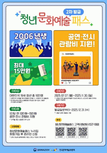 ¡®Ã»³â¹®È¿¹¼úÆÐ½º¡¯ »ç¾÷Àº »çȸ¿¡ ù¹ßÀ» ³»µó´Â û³âµé¿¡°Ô ¹®È¿¹¼ú ÇâÀ¯ ±âȸ¸¦ Á¦°øÇϱâ À§ÇØ ¿¹¼ú ºÐ¾ß °ø¿¬(¿¬±Ø, ¹ÂÁöÄÃ, Ŭ·¡½Ä, ¿ÀÆä¶ó, ¹ß·¹, ¹«¿ë, ÇÕâ, ±¹¾Ç µî)°ú Àü½Ã °ü¶÷ºñ¸¦ ¿¬°£ ÃÖ´ë 15¸¸ ¿ø Áö¿øÇÏ´Â »ç¾÷ÀÌ´Ù.